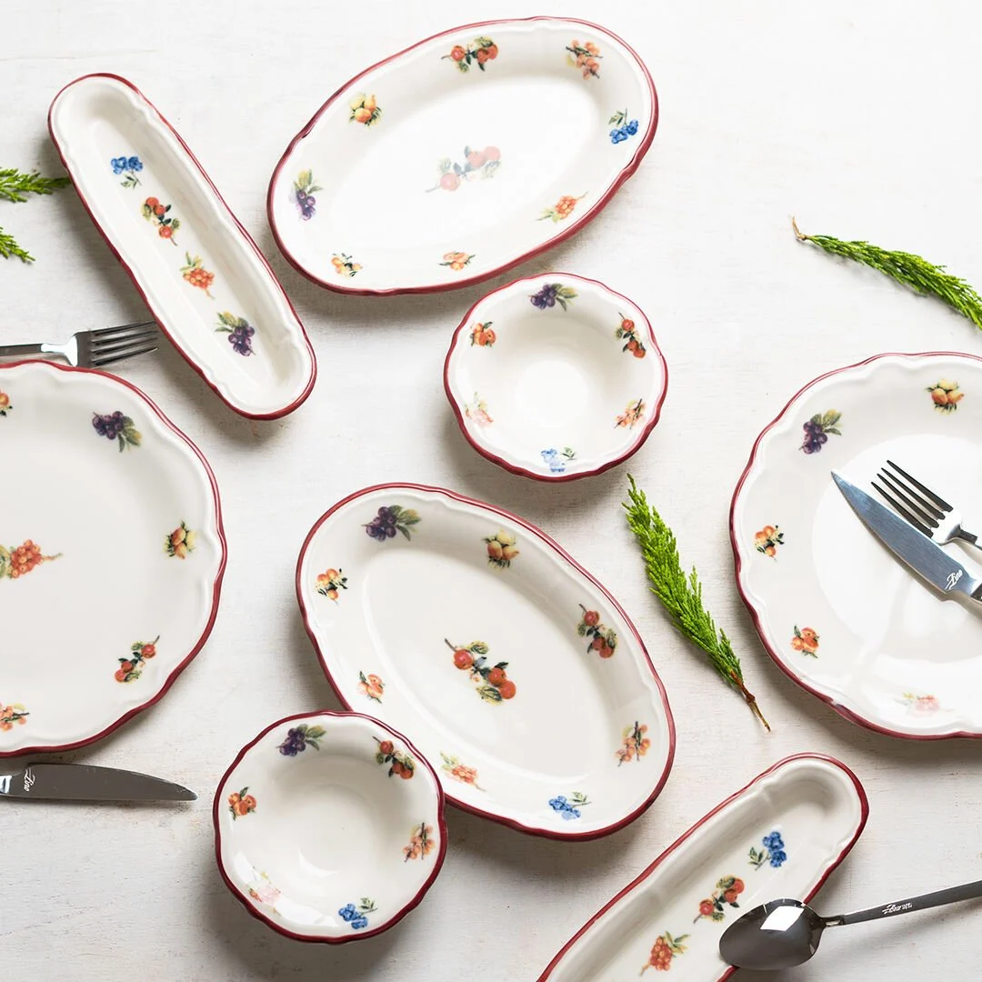 Estetik ve Fonksiyonellik Harmanı: Bu set, 6 adet 22 cm düz tabak, 4 adet 12 cm reçellik, 2 adet 23 cm zeytinlik ve 2 adet 21 cm oval kayıktan oluşur. Her parça, zarif doğa ve yeşillik desenleriyle süslenmiştir, sofranıza doğanın tazeliğini ve huzurunu getirir.